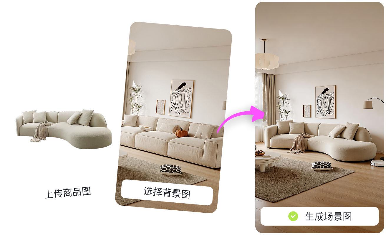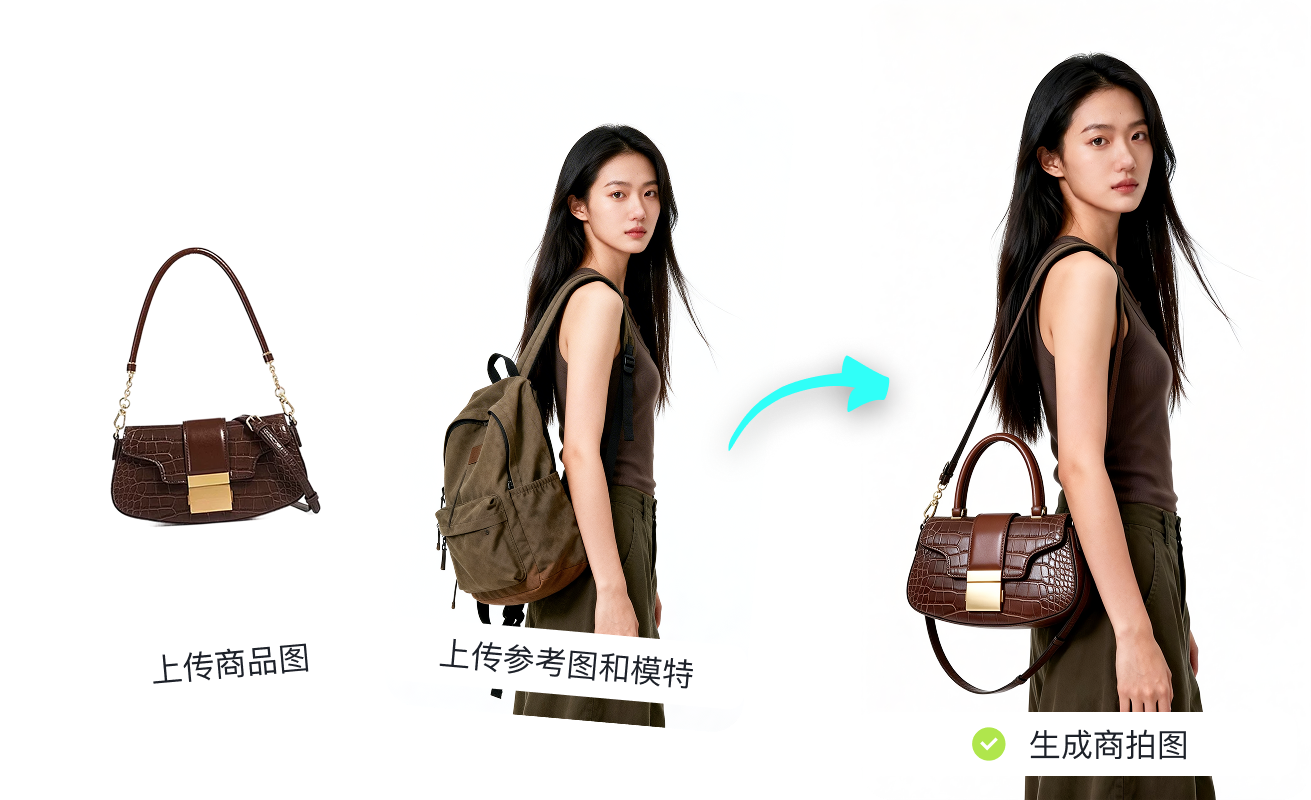 支持对一件商品快速切换展示空间。无论是高档客厅、街角咖啡馆还是户外旅行,一键生成将单品自然融入,轻松搞定多场景应用图