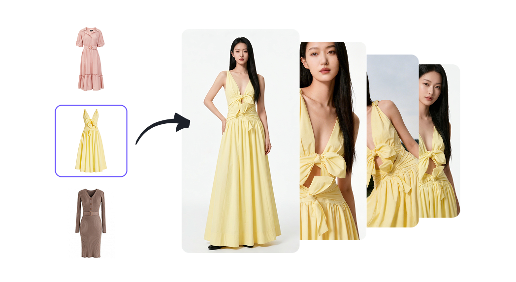 面向新品上架场景。只需上传基础单品图,即可自动匹配真实环境光影,一键直出电商高清主图与详情页。无需复杂的后期修图,极速搞定多角度、多场景展示,直接推进商品上架流程。