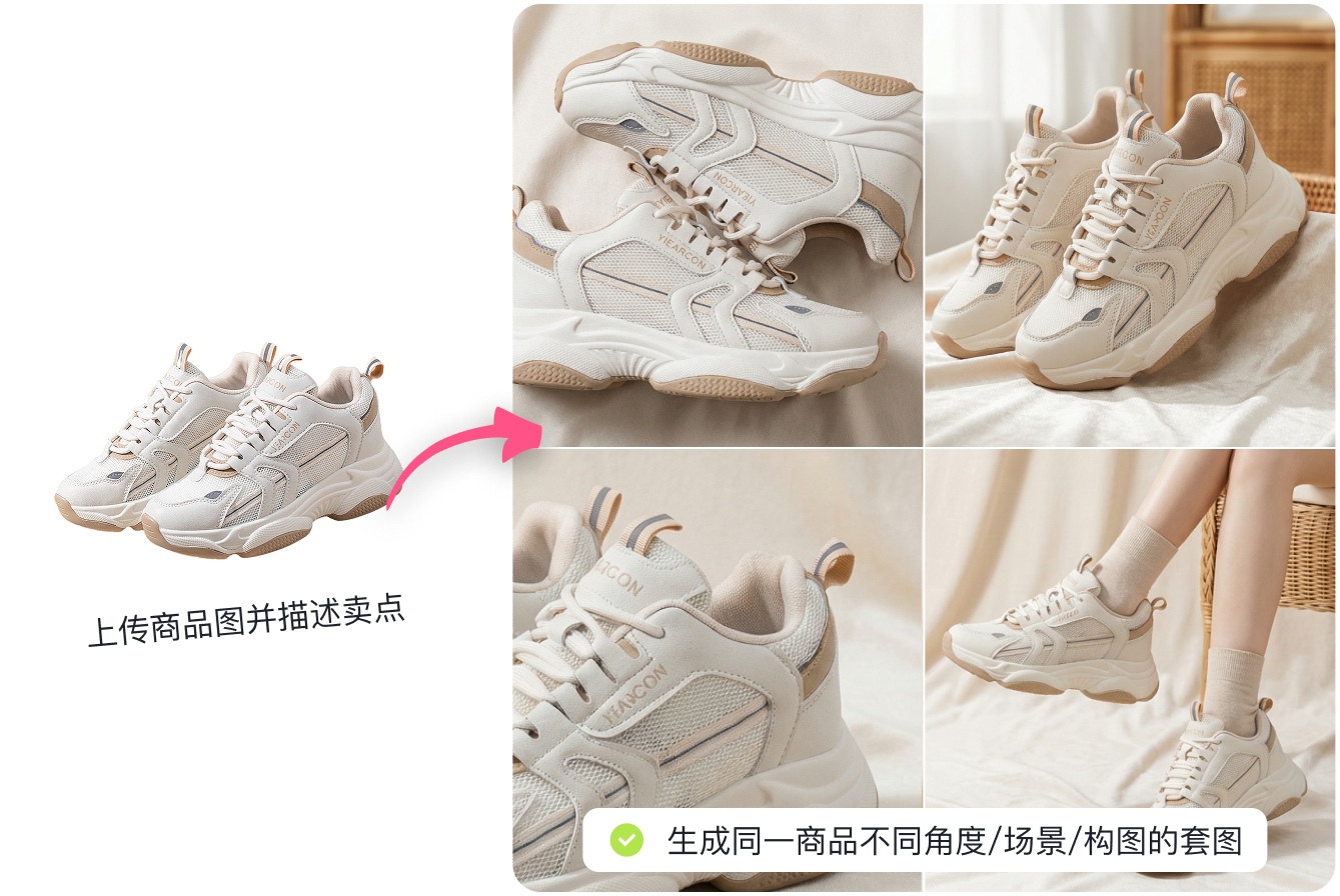 支持上传一张商品图,就能自动延展出不同角度、场景和构图的系列图。一次操作,直接拿出一整套可以直接用于上架的视觉素材